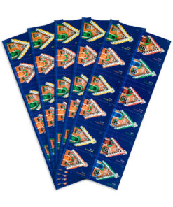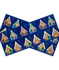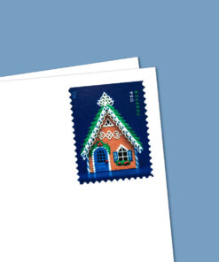This stamp is part of a block of four issued for the 2013 holiday season. Designers constructed the gingerbread houses specifically for the stamp.